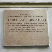 Elena Clara Antonia Carrara Spinelli (13 March 1814, in Bergamo โ 13 July 1886, in Milan) was an Italian woman of letters and backer of the Risorgimento, usually known by her married name of countess Clara Maffei or Chiarina Maffei.