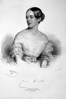 Clara Anastasia Novello (10 June 1818 – 12 March 1908) was an acclaimed soprano, the fourth daughter of Vincent Novello, a musician and music publisher, and his wife, Mary Sabilla Hehl. Her acclaimed soprano and pure style made her one of the greatest vocalists, alike in opera, oratorio and on the concert stage, from 1833 onwards. In 1843 she married Count Gigliucci, and retired in 1861. Charles Lamb wrote a poem ("To Clara N.") in her praise.[1]