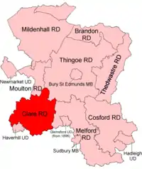 Clare Rural District was a rural district in the county of West Suffolk, England. It was created in 1894, comprising those parishes in the Risbridge rural sanitary district which were in Suffolk.