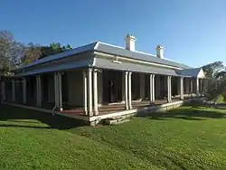 The house is symmetrically arranged with French doors opening onto the verandah, which extends around the sides of the house. There is a stone paved verandah at the rear. The verandah roof has been reconstructed to its original form of a concave profile roof supported by simple posts on plain plinths.[1]