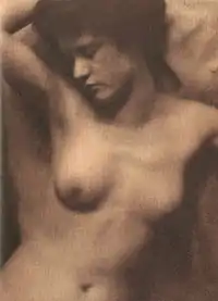 During this same year White and Stieglitz undertook an artistic experiment in which they jointly created a series of photographs of two models, Mabel Cramer and another known only as Miss Thompson.[28] Stieglitz offered suggestions about posing the models, White focused the camera, and one or the other of them would snap the shutter. White also developed the negatives and printed the photographs. One of the intentions of the experiment was to try a variety of printing techniques and papers, including platinum, gelatin silver and gum bichromate prints. On a few signed of the prints they signed with a monogram that combined both of their initials. During this collaboration, White learned the Autochrome color process from Stieglitz, who had just returned from Europe with this technical knowledge. White and Stieglitz jointly created at least one Autochrome during this time, which they exhibited later in the year.[29]