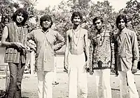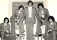 Wijewardena formed the Moonstones at the age of 21 with Annesley Malewana as lead vocalist.[7][5] Managed by an advertising icon, Sri Sangabo Corea, the group recorded several songs, which aired on the Saturday Star program in 1966. The young musicians were mentored by Sri Sangabo Corea, together with veteran Radio Ceylon/SLBC broadcasters Vernon Corea and Vijaya Corea. Their 1968 debut EP "Mango Nanda" was released on the JVPC007 Philips label selling up to 5,000 copies.[8] It included the songs Mango Nanda, Ruwan Puraya, Seetha Ude and Menike. Their second release "More Hits by the Moonstones" came out in November that year, on the Sooriya label and included the hits Kalu Mama, Rosa Male, Ramani and Goyam Kapanawa.[6] Later the song Mango Nanda was selected the best Sinhala song by the Hit Parade program on Radio Ceylon as well.[9] In 1969, the Moonstones welcomed female vocalist Indrani Perera who sang lead on the best selling hit Dilhani. Wijewardena himself only sang lead on Dileepa Podi Puthu an adaptation of a poem written by Karunaratne Abeysekera to his son.[5]