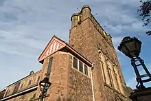Among the many places of worship in Leicester are Congregational churches.[3][4][5] The first Congregational church in Leicester was founded in 1801. Numerous others were built in the 19th century.[6] The Clarendon Park Congregational Church was designed by James Tait (1834-1915) and built in 1886.[7][8][2] It is built of granite rubble with ashlar dressings and a roof of red tiles. It was designated a Grade II listed building (13613930) in 1975.[9]