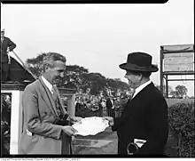 ![]() C. George McCullagh (left) receives the 1940 Clarendon Plate, at Thorncliffe Park race track | |