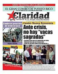 Claridad ("Clarity") is a Spanish-language weekly newspaper based in San Juan, Puerto Rico. It was founded in June 1959. The paper served as the official publication of the Puerto Rican independence movement and later the Puerto Rican Socialist Party (PSP). The paper has been praised for its strong political and investigative reporting. It continues to be published weekly despite the fact that the PSP was disbanded in 1993. Many former PSP members continue to contribute to the paper.