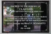 Clarinda (sometimes known also as Clorinda) (c. 1746 - c. 1806) was an Indian Christian missionary, founder of a church in Tirunelveli. She was the first Christian convert of Tirunelveli and also built the first Church of Protestant Christian worship, namely, the well known, Clarinda Church, situated near St. John's College, Palayamkottai, Tirunelveli.[1][2]