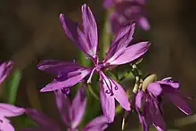 Clarkias are typically annual herbs, growing either prostrate or erect to a height of less than 2 metres. Their leaves are small and simple, from 1 to 10 cm in length depending on the species. Their flowers have four sepals and four petals, usually white, pink, or red, and are often spotted or streaked. Their fruit are elongated, cylindrical pods, usually 4-grooved or 8-grooved, and when mature they hold many tiny, cubical seeds.[1]