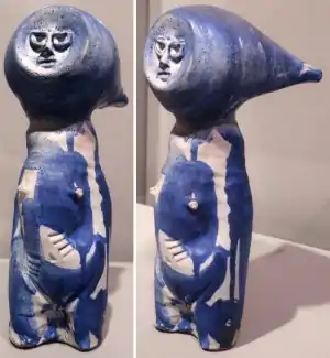 Standing Female Figure, in the collection of the Honolulu Museum of Art is an example of the whimsical ceramic figurines for which he is best known. He begins with a cylindrical vessel on the potter's wheel, onto which he sculpts human features.[3] The Hawaii State Art Museum, the Honolulu Museum of Art, the Museum of Arts and Design (New York City), and the Division of Ceramics and Glass of the National Museum of American History (Washington, D.C.) are among the public collections holding work by Claude Horan.[4][5] His sculptures in public places include: