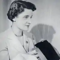 By the mid 1950s, Saint-Cyr's reputation as a milliner was so great that reproductions of her Paris originals were created under licence, alongside those of leading couturiers such as Cristóbal Balenciaga.[12] As well as designing for Norman Hartnell in London, she was producing models for Paris fashion houses such as Dessès.[13] In London, her designs appeared at the fashion shows of the Incorporated Society of London Fashion Designers. At the fashion show for autumn 1959, for example, she showed a line of high-crowned hats – many in velvet – to complement Hartnell's two-colour tweed suits and fur-trimmed and fur-collared coats.[14]