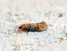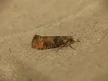 The wingspan is 10–12 mm The forewing is reddish brown with narrow, grey cross-bands.