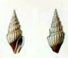 The shell grows to a length of 19 mm, its diameter 7 mm. The ground color of the shell is white. The interstices between the ribs are red, while the lowest part of the body whorl is dark red. The very acute, turriform shell contains 10 whorls. The first 2-3 are not shouldered, the others are shouldered, concave above the angle, below hardly convex. The shell shows many opisthocline ribs of which the higher parts are thickened. They show minute red dots at the angle. The body whorl is very large compared to the length of the shell. The aperture has an oval shape. The outer lip is sharp and slightly sinuated. The siphonal canal is very short.[2]