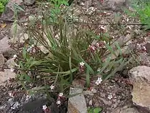 The inflorescence holds several flowers on drooping pedicels which turn erect as the plant develops fruit. The flower has five lobed petals each a few millimeters long and in shades of pink, white, or pink-streaked white.