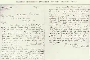 2. "Invention of the Venturi Meter". Nature. 136 (3433): 254. August 17, 1935. Bibcode:1935Natur.136Q.254.. doi:10.1038/136254a0. [The article] reproduces a letter from Herschel to the late Dr. Unwin describing his invention of the Venturi Meter. The letter is dated June 5, 1888, and addressed from the hydraulic engineer's office of the Holyoke Water Power Co., Mass. In his letter, Herschel says he tested a one-inch Venturi Meter, under 210 ft. head: 'I am now satisfied that here is a new and pregnant principle to be applied to the art of gauging fluids, inclusive of fluids such as compressed air, illuminating or fuel gases, steam, etc. Further, that the shape of the meter should be trumpet-shaped in both directions; such a meter will measure volumes flowing in either direction, which in certain localities becomes a useful attribute...'