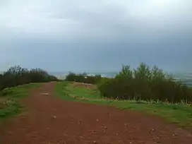 The hills along with the Lickey Hills form a range of hills in north Worcestershire known as the Clent-Lickey range (or the Clent-Lickey ridge).[10][11] The largest of the Clent Hills is Walton Hill which is 1,037 feet (316 m) high followed by Clent Hill at 1,014 feet (309 m). They are separated by a valley known as St. Kenelm's Pass, which starts as an escarpment one side of which along with the sides of the two hills falls away towards Uffmoor Wood; water flowing down this slope enters streams which become the River Stour. Close to the top of the escarpment, but just on the other side, stands High Harcourt Farm (which belongs to the National Trust,[12] but its farm land is not open to the public). Below the farm the escarpment falls away and becomes a sharp V valley in which a stream flows down into Clent village. Where the valley sides are at their steepest the Walton Hill side of the valley is known as Clatterbach. In the past, before steam power replaced water power, the stream in the valley was dammed at regular intervals to provide power for watermills. The remains of one such dam can be seen behind the Vine Inn in Clent which was once a mill.[13]