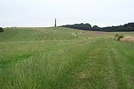 The Clent Hills lie 10 miles (16 km) south-west of Birmingham city centre in Clent, Worcestershire, England. The closest towns are Stourbridge and Halesowen, both in the West Midlands conurbation (and also historically in Worcestershire). The Clent Hills range consists of, in order from north-west to south-east: Wychbury Hill, Clent Hill (and Adams Hill), and Walton Hill (and Calcot Hill).[2] The north Worcestershire range of hills continues eastwards to include Romsley Hill, Waseley Hills and the Lickey Hills.[3][4]