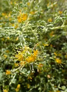 Cleomella obtusifolia is a species of flowering plant in the cleome family.[2] It is commonly known as Mojave stinkweed, bluntleaf stinkweed or Mojave Cleomella.[3] It grows in alkaline soils in the desert scrub.[4] It is an annual herb producing a rough, hairy stem.[5] The branching stem grows erect when new and then the branches droop to the ground with age, forming a bushy clump or mat. Each leaf is made up of three fleshy oval leaflets. Flowers appear in dense racemes on older stems and solitary in leaf axils on new stems. Each flower has generally four hairy green sepals and four yellow petals grouped together on one side of the involucre. The whiskery yellow stamens protrude up to 1.5 centimeters from the flower. The fruit is a hairy, valved capsule a few millimeters in length. It hangs at the tip of the remaining flower receptacle.