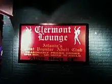 The Clermont Lounge is Atlanta's first and longest continually operating strip club, opened in 1965 and boasts a completely female ownership. Located in the basement of the Clermont Motor Hotel at 789 Ponce De Leon Avenue, in the Poncey-Highland neighborhood, the dive bar[1] has survived multiple attempts at being closed by the Atlanta city government, and has established a nationwide reputation for its kitschy atmosphere and unusual dancers. The Clermont has been featured on an episode of Insomniac with Dave Attell. Celebrities known to have visited the Clermont when in Atlanta include Anthony Bourdain, Colin Firth, Marilyn Manson, Cole Sprouse, Ashton Kutcher, Kid Rock, Steven Yeun, Skinny Lister, Lady Gaga, Eric Roberts, Ming Chen, Jason Zimmerman and the Guys Weekend as well as David Cross and Bombay Bicycle Club. Visitors to the Clermont usually alternate between a few handfuls of regulars and large numbers of college students, newcomers to town, and tourists.
