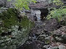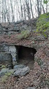Cliff Cave, also known as Indian Cave, is a natural cave that is considered the second longest cave in St. Louis County, with 4723 ft (1514 m) of cave passage surveyed.[3][9] It is found at the head of a ravine, with a stream flowing from the entrance.[19] It is developed in Mississippian Period St. Louis limestone.[3] The cave maintains a temperature of 57 °F (14 °C) all year round.[4] The cave was created from the karst plateau in the area forming many sinkholes, dissolving the dolomite/limestone bedrock over time.[4] The cave is connected to a number of these sinkholes, causing the cave to be susceptible to flash flooding.[4]