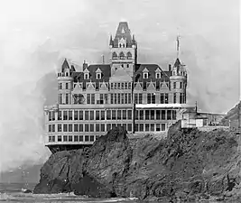 Anecdotal stories claim that in 1858 Samuel Brannan paid $1,500 for lumber salvaged from a ship that foundered on the rocky shore's basalt cliffs near Seal Rocks[5] and built the first Cliff House. While Brannan may have constructed a building there, no historical evidence of this building exists and its role in the origin of the Cliff House remains apocryphal.[6] The Cliff House was built by Senator John Buckley and C. C. Butler, opened in 1863 and leased to Captain Junius G. Foster.[7][8][9] It was a long trek on foot from the city and the restaurant hosted mostly horseback riders, small-game hunters or picnickers on day outings. With the opening of the privately built Point Lobos toll road a year later, the Cliff House became a Sunday destination among the carriage trade. Later the builders of the toll road constructed a two-mile speedway adjacent to it where well-to-do San Franciscans raced their horses along the way. On weekends, there was little room at the Cliff House hitching racks for tethering the horses for the thousands of rigs. Soon, omnibus, railways and streetcar lines made it to near Lone Mountain where passengers transferred to stagecoach lines to the beach. The growth of Golden Gate Park attracted beach travelers, in search of meals and a look at the sea lions sunning themselves on Seal Rocks just off the cliffs, to visit the area. In 1877, the toll road, now Geary Street, was purchased by the city for approximately $25,000.
