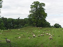 The Betty Watson's Hill Bronze Age barrow 1,120 feet (340 m) east of Cliffe Hall was excavated in 1904. It was described as a flat-topped bowl barrow, and it was noted that "the large hole in the centre is probably due to robbers or an unrecorded excavation".[37][38] In 2007, a cup-marked 29×23×16 cm boulder with two 5 cm cups was found in field-edge dumps 50m south-east of the Betty Watson's Hill barrow. "The cobble was removed from the field edge and placed back on the barrow top. This now puts an early Bronze Age date to the monument." The boulder is believed to have originated in the robbed-out barrow.[4][39] A round barrow is recorded 190m south-east of Cliffe Hall.[4][40]
