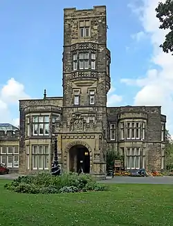 Cliffe Hall was built by Christopher Netherwood between 1828 and 1833, and designed by George Webster of Kendal, a gothic revivalist. The Butterfields, a textile manufacturing family, bought Cliffe Hall in 1848. Henry Isaac Butterfield transformed the building by adding towers, a ballroom and conservatories from 1875 to 1880, and renamed it Cliffe Castle in 1878. He decorated the building with the griffin motif, which he had adopted as a heraldic crest.[5] Sir Nicholas Pevsner describes the building as having an asymmetrically placed tower and Jacobean shaped gables.[6][7]