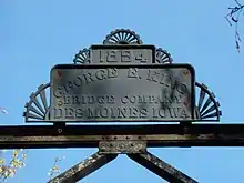 The superstructure is eight panels and includes a floor system made up of 3-by-12-inch (7.6 by 30 cm) treated timbers on five-inch (13 cm) steel I-section stringers which are themselves supported by 12-inch (30 cm) steel I-section floor beams. These beams are fastened to the hip verticals with riveted plates and are riveted directly to the intermediate posts, except for one exception: the first post to the east on the south side is welded to the floor beam with a steel plate set eight inches (20 cm) off-center; it is uncertain whether this was a repair or a correction of the design as it was being built. Both top and bottom lateral bracing consists of eye rods stabilized at intersecting points with bolted plates. The top chords, end posts, and intermediate posts are channels with riveted cover plates and lacing bars. The hip verticals are double forged eye rods, while the diagonals are double punched eye bars. The counters are turnbuckles. The lateral and portal struts are double angles to which portal bracing (double angles) is connected with ledger plates. The portal struts and bracing make up a riveted unit which is bolted to the end posts. Two-by-six-inch (5.1 by 15.2 cm) wooden guard rails are bolted to the bridge with angle sections. A builder's plate is fastened to the top portal struts at each end of the bridge.[3]