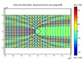 The metascreen consisted of a 66 micrometre thick polycarbonate film supporting an arrangement of 20 micrometer thick copper strips that resembled a fishing net. In the experiment, when the metascreen was hit by 3.6 GHz microwaves, it re-radiated microwaves of the same frequency that were out of phase, thus cancelling out reflections from the object being hidden.[18] The device only cancelled out the scattering of microwaves in the first order.[18] The same researchers published a paper on "plasmonic cloaking" the previous year.[19]