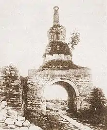 By the early Ming Dynasty (1368–1644) two of the three dagobas on the platform had collapsed or had been dismantled.[7] By the reign of the Zhengtong Emperor (1427–1464) no dagobas remained, and the structure was given the name "Cloud Platform", because from a distance it seemed to rise out of the clouds.[4] A project to restore the platform was carried out between 1443 and 1450. When the platform was surveyed by a Japanese expedition in 1943 a stele commemorating the restoration, dated 1448, was found on top of the platform.[8] However, the restoration was not completed until 1450, as evidenced by an inscription on the far right-hand side of the inner west wall of the platform, dated the 15th day of the 5th month of the 15th year of the Zhengtong era (1450), that records that the restoration was carried out by a benefactor named as Lin Puxian (林普賢).[9] The restoration involved building a five-roomed wooden Buddhist hall, called the Tai'an Temple (泰安寺), on top of the platform, in place of the original dagobas.[2][10]