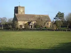 The church (St Cuthbert's) is located on the western edge of the settlement, adjacent to the flood plain of the Clun.