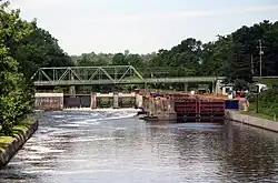 ![]() The Clyde River begins at Erie Canal Lock #27 in Lyons, New York. This view is looking upstream towards the lock. | |