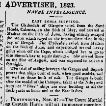 For Calcutta, to call at Madras if sufficient Encouragement offers, the new ship CLYDESDALE, Duncan M'Kellar, commander, burthen 583 tons, coppered and copper fastened: she is in every respect a first class vessel and has very superior accommodation for Passengers, having two elegant large cabins, commodious state-rooms, and an experienced Surgeon on board; is now ready to receive goods, and will sail early in January.[5]