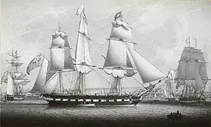 Next, for her third voyage, Clydesdale sailed to Van Diemen's Land and New South Wales. In 1822 she brought as passengers Richard Aspinall, Warham Jemmett Browne, and Thomas Aspinall, nephew of Richard. In 1821 Richard and Edward Aspinall and Browne had established the trading firm of Aspinall, Browne & Co. in Liverpool.[12] Richard Aspinall and Browne brought with them a large assortment of trade goods.[13] They established the firm of Aspinall Browne & Co. in Sydney, with the intent of acquiring wool for Liverpool.[12] From Sydney Clydesdale sailed for Calcutta.