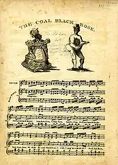 "Coal Black Rose" is a folk song, one of the earliest songs to be sung by a man in blackface. The man dressed as an overweight and overdressed black woman, who was found unattractive and masculine-looking.[1] The song was first performed in the United States in the late 1820s, possibly by George Washington Dixon. It was certainly Dixon who popularized the song when he put on three blackface performances at the Bowery Theatre, the Chatham Garden Theatre, and the Park Theatre in late July 1829. These shows also propelled Dixon to stardom.[2]