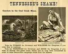 After the American Civil War, Tennessee, like other Southern states, struggled to find sources of revenue. Post-war railroad construction, meanwhile, had opened up the state's coalfields to major mining operations, creating a large demand for cheap labor. In 1866, the state began leasing its convicts to companies willing to pay for the inmates' housing in exchange for their labor, and in 1871 leased convicts to the Tennessee Coal, Iron, and Railway Company (TCI), which owned a large coal and coke operation in the Cumberland Plateau area west of Chattanooga. TCI in turn subleased most of the convicts to smaller mining companies.[1] While there was some resistance among free miners to the use of convict laborers in the 1870s, the abundance of jobs and companies' preference for the higher-quality production of free labor eased the miners' concerns.[3]