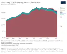 Electricity in South Africa is mostly generated from coal. Most of the country's coal-fired power stations are in the same province as most of the coal mining, Mpumalanga.[17] Many are expensive and unreliable, and this is part of the cause of South African blackouts.[18]