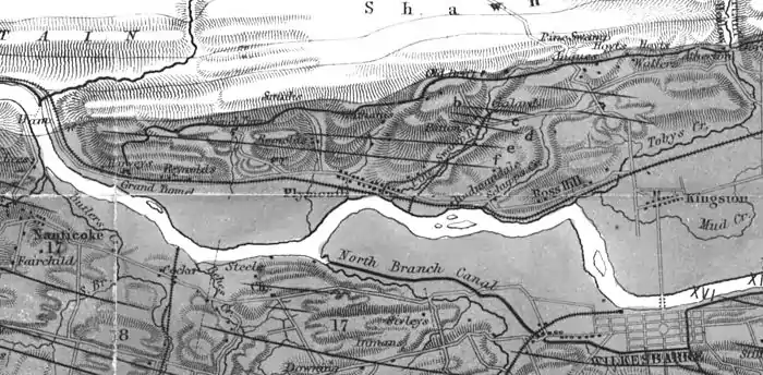 The 1858 map (below), illustrates the path of the railroad. Several collieries appear at the west end of Plymouth, including the Harvey Mine, Grand Tunnel, Reynolds (Chauncey), French Tunnel (Jersey Mine), Reynolds (Washington Mine) and the Smith mine operation at the upper end of Coal Creek. The Wadhams mine appears along Wadhams Creek above Plymouth Village. A railroad branch line (Gaylord's Railroad) is shown running along Pine Swamp Creek (later Brown's Creek). One branch of this railroad crossed what later became Bull Run and led to a wharf along the Susquehanna River. Another branch railroad ran down to Henderson Gaylord's wharf, near what is now Gaylord Avenue. The Patten mine and Cooper mine (labeled as Galard) are shown along the creek. East of Plymouth village, John Shonk's colliery, called Rudmandale, appears where the Lance Colliery would later be, and above that, Shupp's Creek and Ross Hill are illustrated just before the Boston Mine was established.