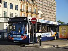 The service has had its own livery from the beginning. It began with a coloured strip along the side of the green Southdown bus; now it is the regular Stagecoach livery, blue, white, orange and red, with the route description on the side, with individual buses having livery related to a certain town along the route, and slogans such as 'We took the Coastliner 700 to fun and fashion'.[2][10]