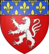 BlazonGules a lion rampant Azure. Upon a chief of Azure three fleur-de-lys Or.