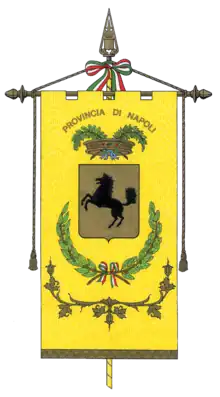 Troncato d'oro e di rosso, caricato dello stemma civico, con l'iscrizione in oro "Comune di Napoli".