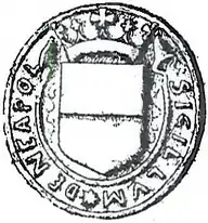 The first evidence in which the current coat of arms is used in an official document of the city is an act dated 31 January 1488, with which the Electi Civitatis Neapolis lodge an appeal against some Gabelles; the document has a seal imprinted on paper in turn attached to the sheet with red wax, on the seal there is the city coat of arms surmounted by a ducal crown and surrounded by the legend Sigillvm de Neapol.[8]