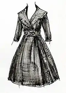 A coatdress or coat dress is a woman's dress that resembles an overcoat, usually with collar, lapels and front fastenings similar to a coat, and made in spring- or autumn-weight fabrics.[1] The modern coatdress first emerged in the 1910s, with a 1915 article in Vogue assuring readers that the new garment could be worn over waistcoats or underdresses.[1] The basic coatdress was a wardrobe staple for most decades, but became particularly popular in the 1960s.[2] In the 1980s and 1990s, Diana, Princess of Wales, was a particularly high-profile wearer of coatdresses, many designed by Catherine Walker.[3][4] The coatdress is often recommended for those wishing to project a professional look,[5] whether in the office,[6] or in the courtroom.[7]