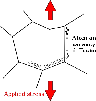 Coble creep and Nabarro–Herring creep are closely related mechanisms. They are both diffusion processes, driven by the same concentration gradient of vacancies, occur in high temperature, low stress environments and their derivations are similar.[1] For both mechanisms, the strain rate is linearly proportional to the applied stress and there is an exponential temperature dependence. The difference is that for Coble creep, mass transport occurs along grain boundaries, whereas for Nabarro–Herring the diffusion occurs through the crystal. Because of this, Nabarro–Herring creep does not have a dependence on grain boundary thickness, and has a weaker dependence on grain size . In Nabarro–Herring creep, the strain rate is proportional to as opposed to the dependence for Coble creep. When considering the net diffusional creep rate, the sum of both diffusional rates is vital as they work in a parallel processes.