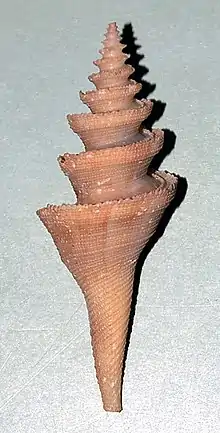 The size of an adult shell varies between 35 mm and 60 mm. The white shell is acutely tapering before and behind. The long and straight siphonal canal has about the same length as the spire. There are nine whorls of which two are embryonic. The aperture is very long and narrow. The anterior surface of the whorls are everywhere sculptured with even uniform spiral rows of rounded nodules, beautifully reticulated by the lines of growth. One row about the middle of the whorl is slightly elevated above the others. The carina is fringed with delicate triangular points. The posterior surface of the whorls, except for lines of growth, is smooth, with one row of nodules just inside the carina. The columella is not thickened, but somewhat twisted anteriorly. The outer lip is sharply angulated by the carina.[4]