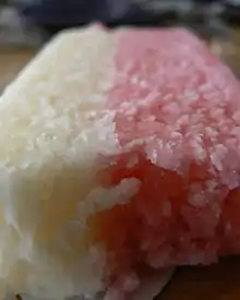 Coconut ice (sometimes Cocoanut ice)[1] is a British confectionery prepared using grated desiccated coconut or just grated coconut, condensed milk and sugar, which is formed to create a solid, soft candy.[2][3][4] It typically has a chewy, soft and mildly grainy texture;[5][4] some versions are semi-hard.[2] Coconut ice is also available in South Africa,[6] some areas of Australia,[7] and New Zealand.[8]