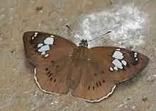 The length of the forewings is 22.5 mm for both males and females. The forewings are dark brown with white spots. The hindwings are dark brown, the basal area covered with hairs and the discal area with a series of black spots.[2]