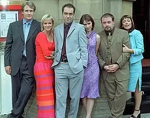 Mike Bullen has sole writing credit on 26 episodes of the series; four episodes of Series 3 were written by David Nicholls, and Bullen co-wrote one episode of Series 4 and 5 with Mark Chappell and Matt Greenhalgh respectively.[45][46] Bullen usually wrote ten pages of script per day, whatever the quality of his writing. His own third draft was usually submitted to the producers as the "first" draft.[9] As he was still an inexperienced writer by the time production of the first series began in January 1998, Bullen was aided by Christine Langan, who pitched in as a script editor.[47] Storylines were planned in advance—the producers knew that they wanted to split up Adam and Rachel at the end of Series 1—but the later scripts were written once filming on earlier episodes had already begun.[48] The number of people on the development team varied; the third series' comprised Bullen, Langan, Harries, producer Spencer Campbell, script editor Camilla Campbell, ITV's controller of comedy, and a team of five writers.[45]
