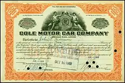 ![]() Share of the Cole Motor Car Company, issued June 6, 1919 | |