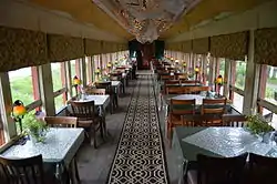 They currently operate a consist of 5 train cars: deluxe coach, dining car, cafe car, lounge car, and parlor car. The fifth passenger car entered service in mid-November 2020 and is a cross between a parlor car and a coach car. The deluxe coach and parlor car are fully restored with their final interiors but the dining and cafe cars have yet to receive their final restoration.