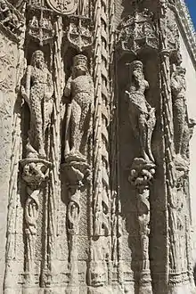 It draw attention to the "savage men" of the jambs and buttresses, a total of sixteen. Theories about the significance of these figures, present in many buildings of 15th-century, are varied and should be put in relation to the context in which these appear. One of its functions would be simple heraldry sculptures. It is also said that, dressed with shield and mace, were the guardians of the building, beastmen guaranteeing security. Or these could allude to the custom of disguising the squires and lackeys in Court (nobility) festivities in which it presented the "savage" as inferior, in relation, for example, the chivalric romances, which mentions hair covered wild men, degraded men, estranged from the civilized world, not Christianized, and could here be in visual confrontation with the knights who also appear on the main facade, with armor, spears and shields, that would be interpreted as allegories of Virtue. On the contrary, these could also be a positive allusion, the mythical image of man in nature, unpolluted, symbol of purity that evokes the time in a perfect and happy world, with prototype to John the Baptist.