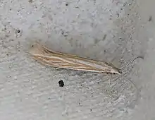The wingspan is 9.5–13 mm.[2] The forewing is cream-coloured with distinct white longitudinal stripes and with oblique streaks and scattered fuscous scales. Certain identification requires examination of genitalia preparations. Adults are on wing in June and July.[3]